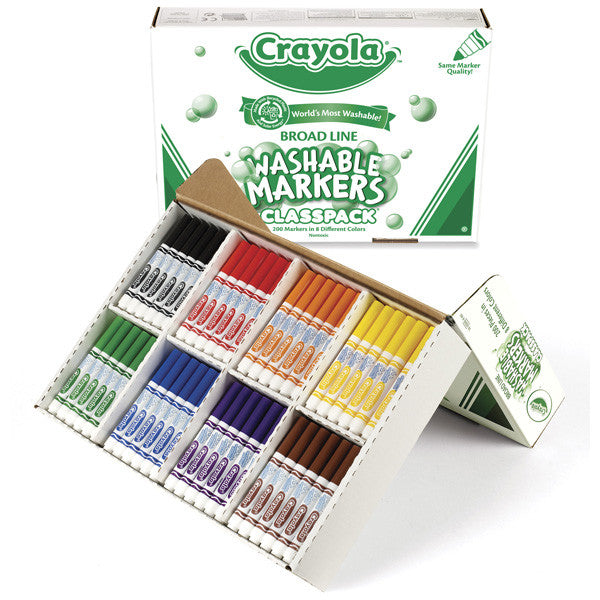 Broad line markers are great for writing or for quickly filling in large spaces with color. This 200 count Classpack of Crayola Washable Broad Line Markers is perfect for supplying a class. It includes 200 markers in 8 different colors. There are 25 each of red, orange, yellow, green, blue, violet, brown and black. These markers are recommended for children ages 5 and older.