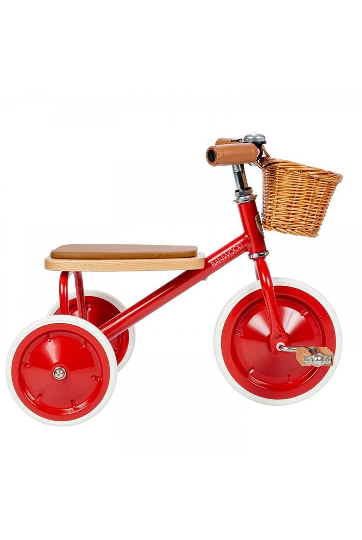 This red tricycle comes with a softly padded oak seat, vegan leather grips, wooden oak pedals, a removable push handle and a cute wicker basket in front to bring along their favorite toys.