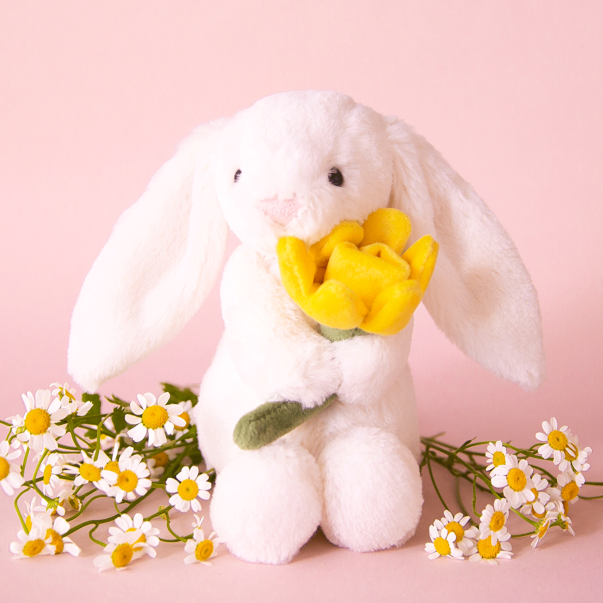 Welcome the fresh new season with Jellycat's adorable Bashful Bunny holding a yellow daffodil. This fuzzy and cuddly stuffed animal is the perfect companion for any adventure. Snuggle up with this playful bunny and let the fun begin!