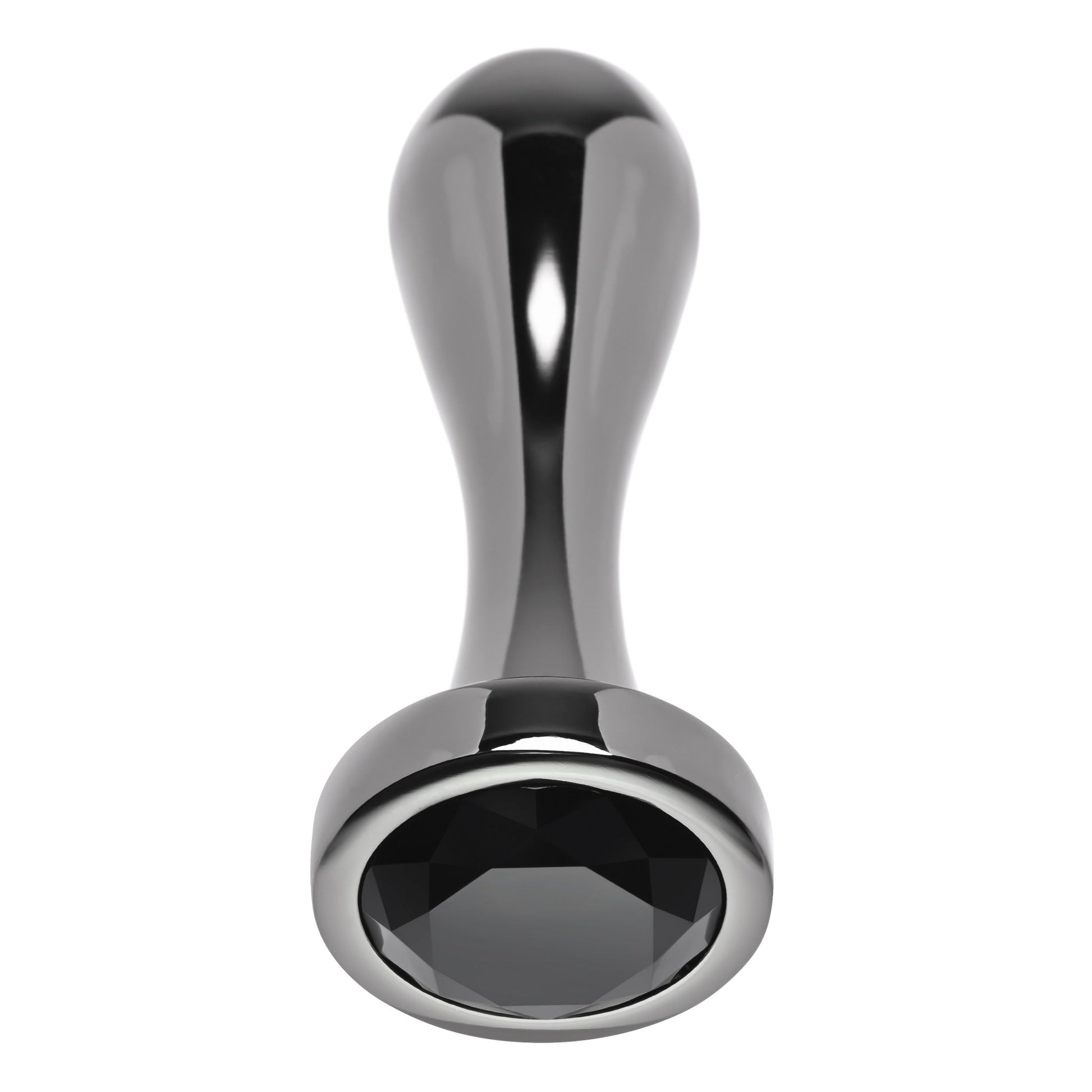 Features: large gunmetal plug with black gem base. Bulbous smooth shape rounded at the tip. Tapers to a slender shaft before wide safety base. Sleek and stylish gunmetal finish. Made from body safe Aluminum alloy. Sparkling black gem made from ABS Plastic. Heat or cool with water for sensation play.