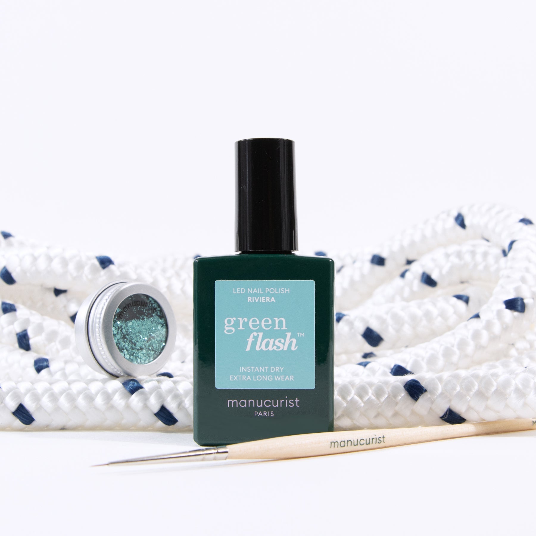 Brushes at the ready! This set contains all the products you need to create the iconic nail art in our Life Aquatic collection: 1 Green Flash? or Green color (Riviera) + Turquoise Biodegradable Glitter + 1 Nail Art Brush.